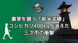 メモ 農家を襲う「新米泥棒」コシヒカリ400kgが消えた三次市の衝撃 三次市で発生した大規模新米盗難事件 新米の収穫が本格化し、コメの価格が高騰する中、広島県三次市で大規模な窃盗事件が発生しました。 9月上旬、三次市に住む70代の農家男性の自宅倉庫から、収穫したばかりの新米約400kgが盗まれました。盗まれた... 2025.09.22 メモ