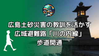 メモ 広島土砂災害の教訓を活かす、広域避難路「川の内線」歩道開通 八木・緑井地区に災害時の新たな道 2014年の広島土砂災害を受けて整備が進められてきた広域避難路「川の内線」の歩道部分が、2025年9月12日から利用開始となりました。この道路は広島市安佐南区の八木・緑井地区に整備され、全長約400メートル... 2025.09.18 メモ
