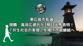 メモ 東広島市長選、現職・高垣広徳氏が3期目出馬表明!「共生社会の実現」を掲げ市政継続へ 高垣市長、来年2月の選挙で再選目指す 市議会で3期目への決意表明 来年2月に実施される東広島市長選挙において、現職の高垣広徳市長が3期目を目指して立候補する考えを表明しました。高垣市長は9月11日、東広島市議会の一般質問の場で、自身の再選に... 2025.09.16 メモ