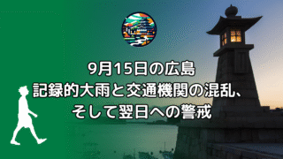 メモ 9月15日の広島:記録的大雨と交通機関の混乱、そして翌日への警戒 2025年9月15日、月曜日ですが祝日:敬老の日で、広島県内は昼過ぎまで日差しが届く穏やかな天気でしたが、午後からは一転、猛烈な雨に見舞われ、各地で警報が発表され交通機関にも大きな影響が出ました。この日の出来事と翌日への注意点についてまとめ... 2025.09.16 メモ