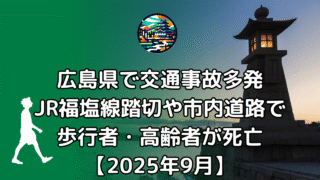 メモ 広島県で交通事故多発:JR福塩線踏切や市内道路で歩行者・高齢者が死亡【2025年9月】 JR福塩線で中年女性が死亡する人身事故が発生 福山市の踏切で列車と衝突、一時運転見合わせ 2025年9月26日午前8時半ごろ、広島県福山市のJR福塩線新市駅近くにある地蔵踏切で、福山駅発府中駅行きの下り普通列車(4両編成)と中年とみられる女... 2025.09.27 メモ