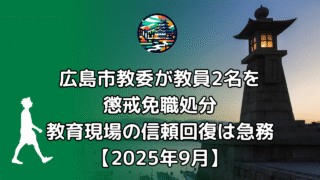 メモ 広島市教委が教員2名を懲戒免職処分 教育現場の信頼回復は急務 女子児童へのわいせつ行為で小学校教諭を免職処分 複数回にわたる行為と処分決定 広島市教育委員会は9月26日付けで、勤務先の小学校の教室で女子児童にわいせつな行為をしたとして起訴された市立小学校教諭(39歳)を懲戒免職処分にしました。 被告は... 2025.09.27 メモ